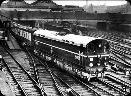 6) ... Thats the system used here in the Southern Region of British Railways. This is the London to Newhaven boat train the first boat train ever to be hauled by an electric locomotive in Britain. Its an interesting locomotive. In order to maintain its pulling power over gaps in the conductor rail, it is fed by two generators which are kept going by a one-ton flywheel, which rotates throughout the journey. Even if the locomotive is brought to rest in the middle of a gap in the electric conductor rails, the flywheel has enough momentum to keep the generators running and so move the heaviest train out of the longest gap in the electrified system.