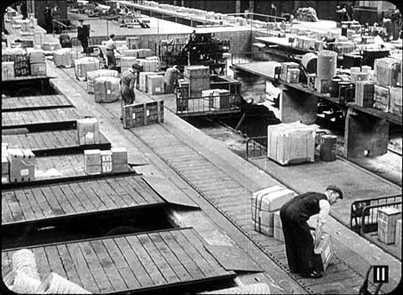 11) In this depot, the rail-head at Lawley Street, Birmingham, the mechanical handling of small consignments is the most up to date in the world. On the left, a row of drays is backed up to the moving belt on which the man is standing. On the right are one. or two loaded trolleys, and in the background are the railway wagons. This shed deals with two kinds of traffic whats called town traffic, which is loaded on to drays for delivery in Birmingham and district, and transship traffic, which is loaded in rail wagons for further destinations.