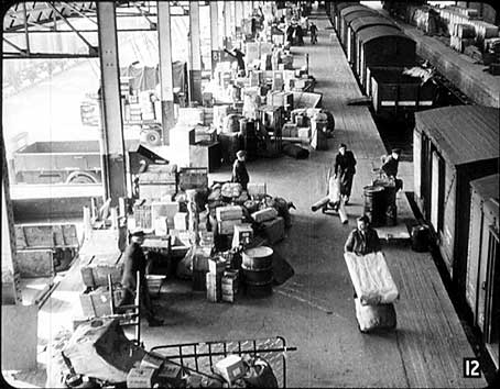 12) Here, for instance, is Swindon, one of a number of what we call railhead distribution centres. Such centres have been established all over the country, and to this one traffic from a wide area of the West of England is con-signed. The train comes in at the right, is unloaded on to the platform, and the merchandise is separated on the platform according to its destinations. The same process, of course, takes place in reverse at the same time goods coming in by road and being loaded into wagons.