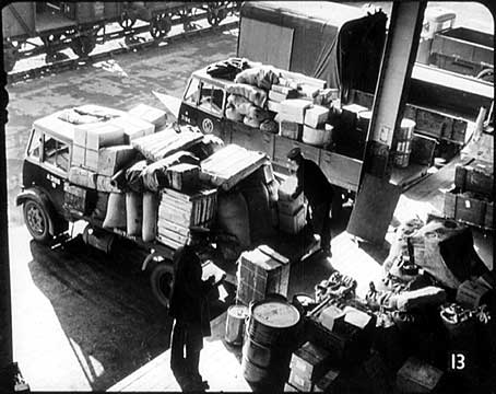 13) In this next picture we can see the process taken a stage further. The road van, which is owned and operated by the railways, has now got its load almost complete. On the left you can see the checker with the list of goods, which will later be handed over to the driver when he takes the lorry away.