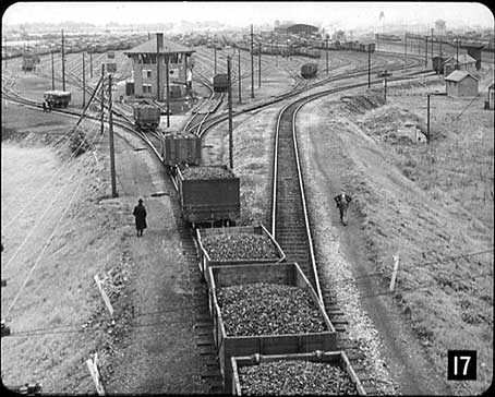 17) This picture, taken at one end of the marshalling yard at Whitemoor, in Cambridgeshire (the largest sorting sidings in Europe), shows the process in greater detail. The wagons come into the yard from this end. Theyre then uncoupled and pushed over the brow of a hill known as 'the hump by a shunting engine, so that one wagon after another detaches itself from the rest and runs down-hill. All the sidings behind the control tower are numbered according to the part of the country they serve. In the tower a man works an automatic device which alters the points outside according to which siding, or road as its called, the wagons should run into. On each set of rails there is a retarder which is used to slow the wagons down to the right speed for running into the siding.