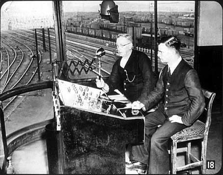 18) Now here are the men in the control tower. This, by the way, is at Toton, near Nottingham, but the principle is exactly the same. On the desk are lines which correspond to the tracks; and the buttons, which have a sort of miniature signpost on them, are turned round to move the points at the entrance to the yard. The older man is holding a microphone in his hand by which he can speak through loud speakers to the men on duty outside in the marshalling yard.