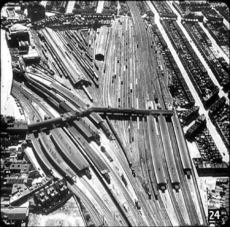 24) Here you have something different. This is Clapham Junction, in South London. It is the busiest railway junction in the worid. More than two thousand five hundred trains pass through here every twenty-four hours that is an average of two a minute all through the day and night. Actually, at the peak period, there is a train passing about every twenty seconds, and it has been worked out that about two thousand passengers ride through the station every minute during the morning and evening peak periods. The trains go between London and the suburbs, and to the South Coast, Portsmouth and the West of England. You can see that Clapham is really two stations one over on the left, and one on the right. You can see the platforms, roofed in, and the footbridge which connects all the platforms. There is a train going to London thats towards the bottom of the picture and several other locomotives and trains, too.
