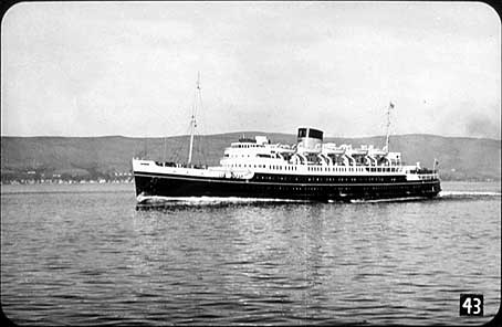43) Here, on her trials off Holyhead, is the motor vessel Hibernia, one of the ships in which passengers by the Irish Mail from Euston to Holyhead travel to complete their journey to Dublin. Shes a ship of over 5,000 tons, and has accommodation for 2,000 passengers. She and her sister ship Cambria are among Britains largest cross-Channel vessels. Hibernia, of course, is the ancient name for Ireland, and Cambria that for Wales.